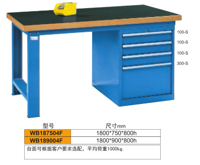 工作臺(tái)WB187504介紹: 工作臺(tái)采用優(yōu)質(zhì)冷扎板精工制作而成,堅(jiān)固的工作桌框架,牢固平穩(wěn),可使工作桌承重1000kg;多種工作桌面選擇,可配合不工使用的要求; 該工作臺(tái)配置了50厚高分子復(fù)合臺(tái)面,適用于檢測(cè),維修等;工作臺(tái)左側(cè)配3*100,1*300四抽落地柜,抽屜可配分格,有利于現(xiàn)場(chǎng)物料的整理,規(guī)劃。