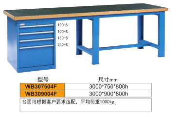 工作臺WB307504介紹: 工作臺采用優(yōu)質冷扎板精工制作而成,堅固的工作桌框架,牢固平穩(wěn),可使工作桌承重1000kg;多種工作桌面選擇,可配合不工使用的要求; 工具吊柜(箱),側柜(箱)燈架,調節(jié)腳杯,外形美觀;層板,抽屜質量上乘,承重大,抽屜內可根據(jù)需要任意分隔;節(jié)約空間,適用性強