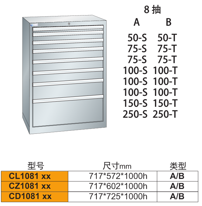 工具柜工具柜C-1081介紹:工具柜適用于工具、刀具、零部件在生產(chǎn)現(xiàn)場中的定置管理,8抽抽屜式設(shè)計,使你的物品存取工作真正做到準時、準確、高效、低耗。