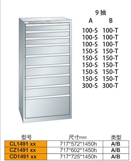 -工具柜C1491介紹:工具柜適用于工具、刀具、零部件在生產(chǎn)現(xiàn)場(chǎng)中的定置管理,9抽抽屜式設(shè)計(jì),使你的物品存取工作真正做到準(zhǔn)時(shí)、準(zhǔn)確、卓效、低耗。