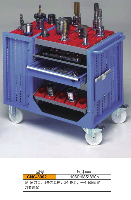 刀具車是存放、搬運(yùn)刀具的裝備,此類刀具車可存BT30、BT40、BT50、HSK63、HSK100等多種型號的刀具。多邊成型的整體式側(cè)板上有模數(shù)化的人字孔,可將刀座按水平或15°、30°傾斜放置,方便多種刀具的存取。 高強(qiáng)度腳輪,車前為兩個定向輪,車后為兩個萬向帶 剎車輪,推行平穩(wěn),方向性好,剎車固定后不會滑動。