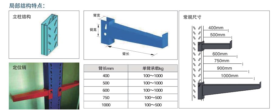 1、懸臂貨架系列全部采用組合式,拆裝,運輸,調(diào)節(jié),移動等簡易方便,安全可靠